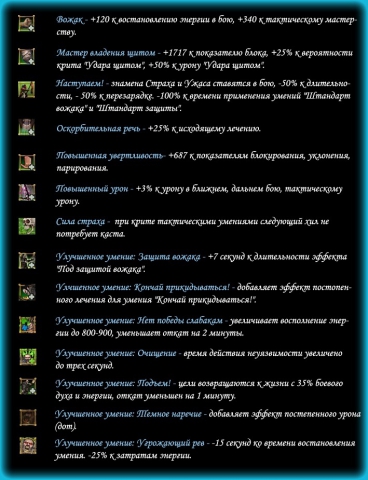 Знамя ужаса - .., накладывает на ближних врагов дебаф, снижающий их сопротивление и смягчение. Длительность действия - 2 минуты. Откат - 5 минут.